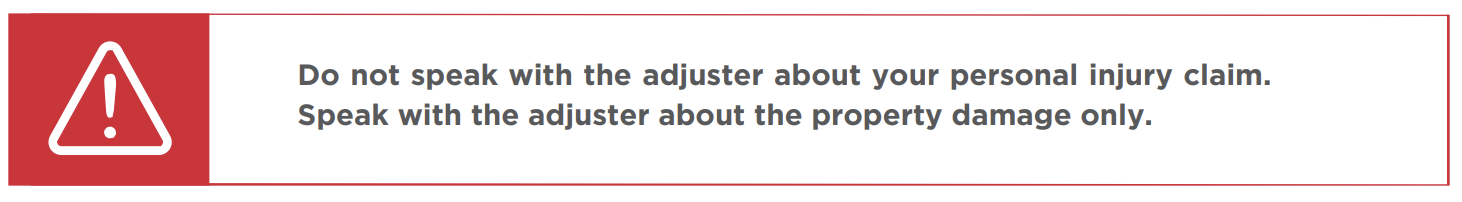 Talking to the Adjuster: It’s generally okay to talk to the adjuster, but make sure that your conversation is only about property damage. If they want a “recorded statement” about your injuries, politely decline and consult with an attorney promptly. If you’re injured, don’t discuss your injury claim with the adjuster without talking to an attorney first.